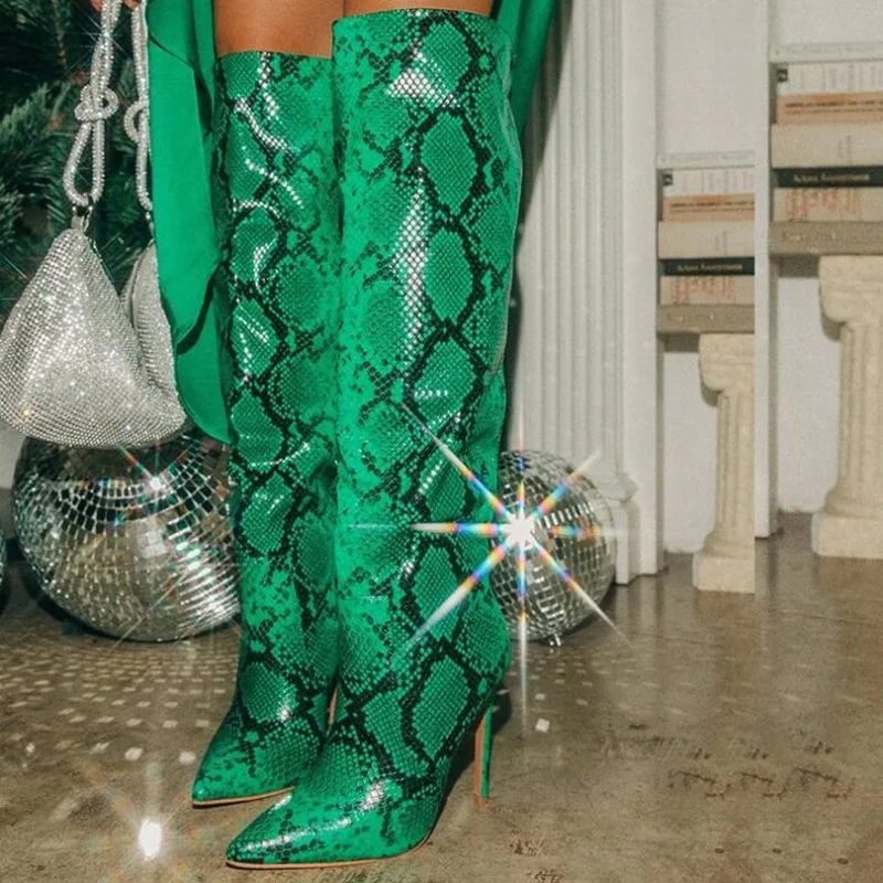 "Green Snakeskin Leather Knee High Boots Python Pattern Pointed Toe Cover Thin Heels Long Boots Plus Size 43" * Buy Now With Free Shipping Just For $93