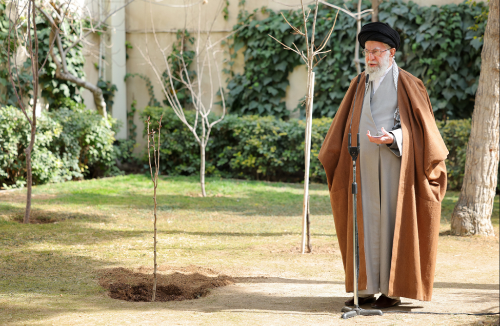 The last time was just a year earlier. On March 5, 2025, Ayatollah Khamenei planted three saplings in that courtyard, stood beside them, and spoke briefly to the people. This was the final stroke of green that he drew upon the face of that land.