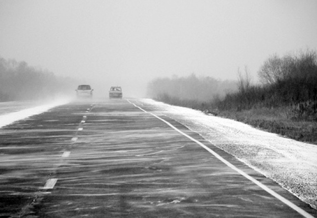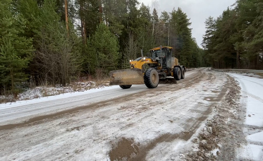 Грейдер до Варзуги (47К-011) . . . Дорога в Кузомень . . . То, что на фото выглядит как темный асфальт на самом деле является прозрачным льдом . Автодорога Мурманск — норвежская граница (Р-21)