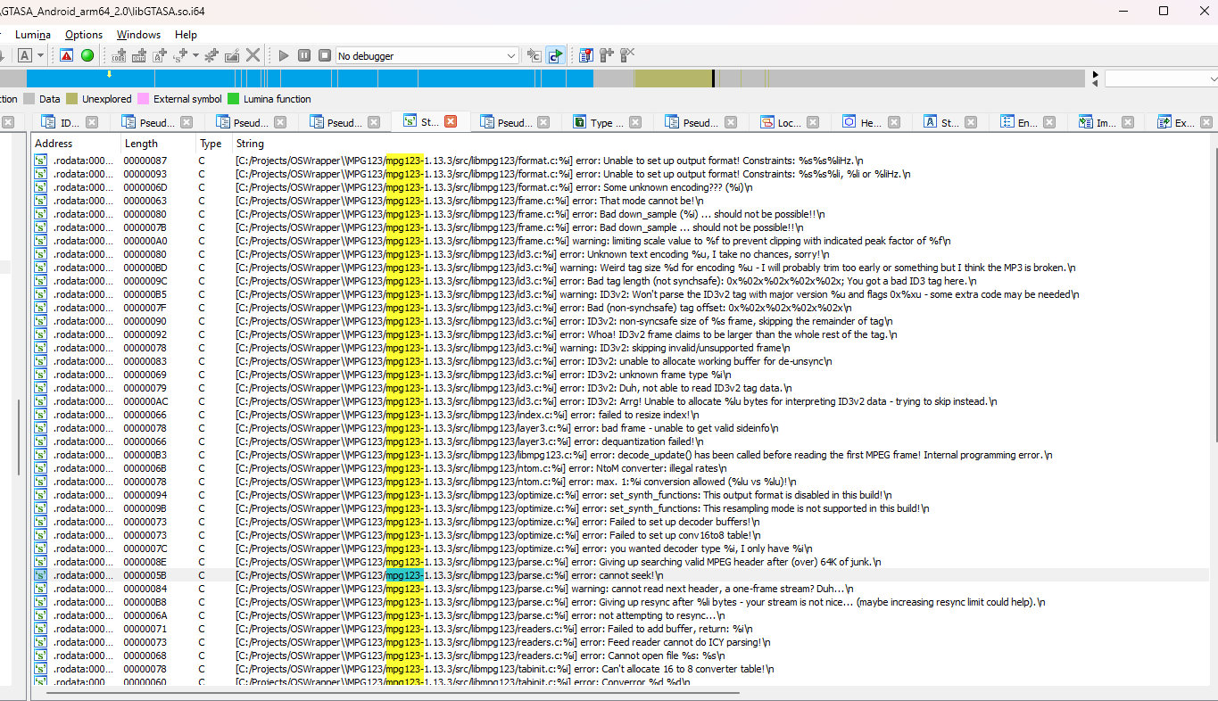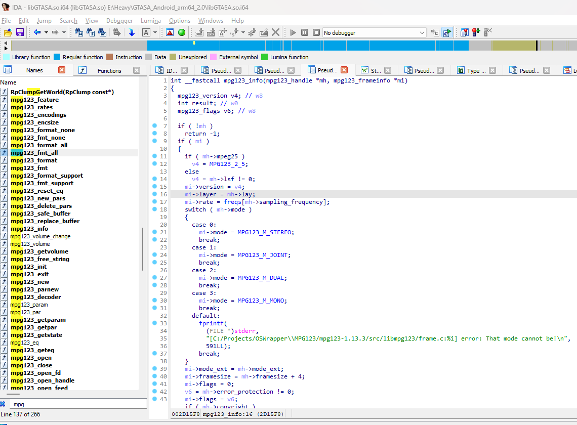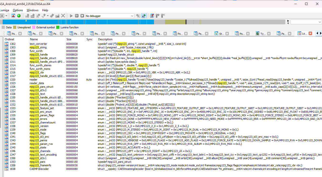 - Debug information including complete structure and enum information from mpg123 (attached screenshot as well - only on GTA: San Andreas for Android, since they ship full debug info for that)