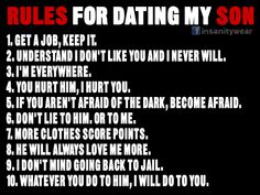 Rule One: If you pull into my driveway and honk you'd better be delivering a package, because you're sure not picking anything up . Rule Two: You do not touch my daughter in front of me . You may glance at her, so long as you do not peer at anything below her neck . If you cannot keep your eyes or hands off of my daughter's body, I will remove them .