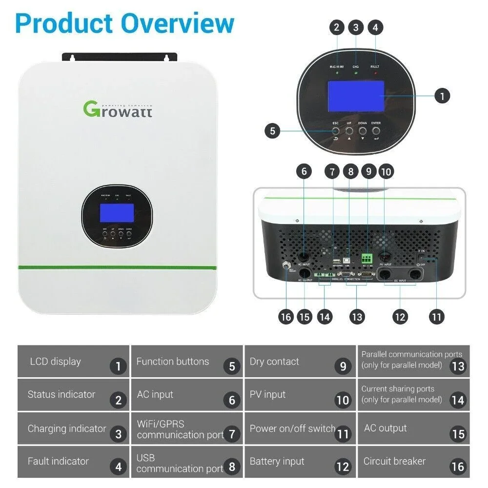 rgRprCZeLHere you can buy Growatt 3kw 5kw Solar Inverter Off-Grid 24V 48V 230VAC With WIFI Module Built-in MPPT Charge Controller PV Inverters SPF3000 HVM with free delivery to your post office.