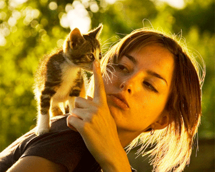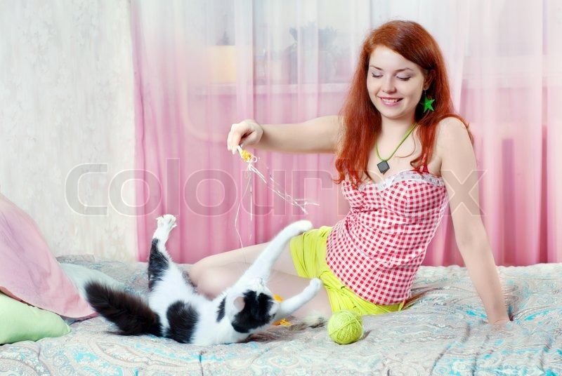 Грустная девушка играет с киской