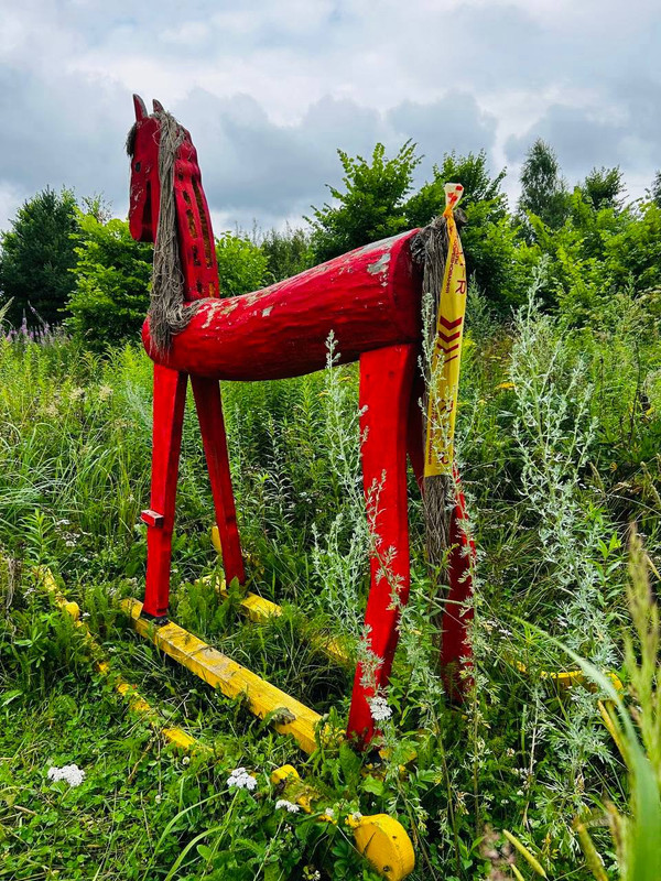 Пробегаем деревню. Здесь какой-то музей (или что-то подобное?) разметка привязана к красной деревянной лошади. Теперь я начинаю прикидывать, сколько осталось до третьего ПП и начала лесной автономки.