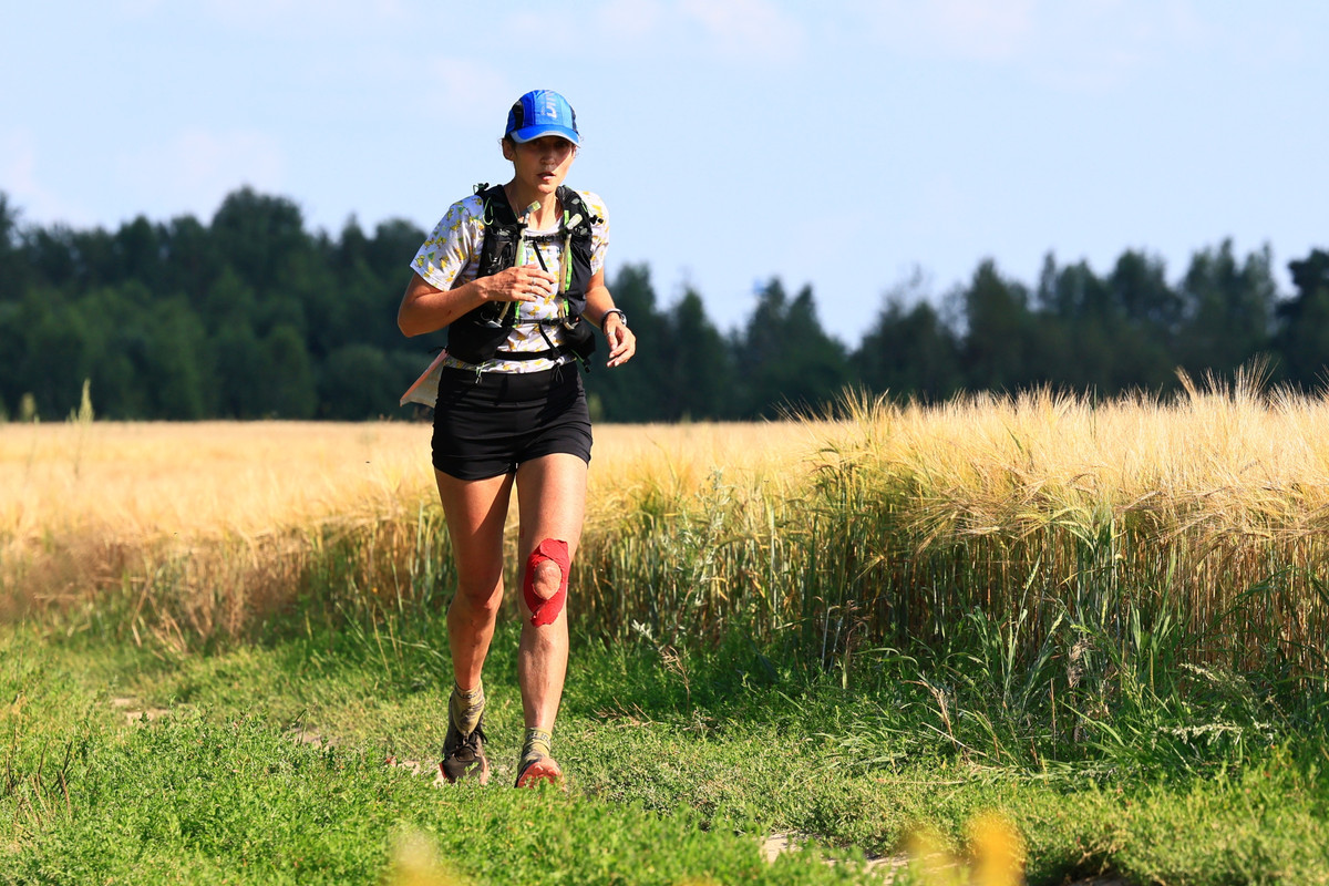 Грунтовая дорога, справа поле, слева река. Ничего не меняется. Километре на 27-28-м вижу впереди шагающую фигуру. Мне кажется, что я ее знаю. Догоняем. Не кажется. Это наша Юля Руденко. Вчера она говорила, что не очень себя чувствует. И вот. Меня удивляет, что она зачем-то идет вперед, хотя логичнее вернуться на 5 километров назад ко второму ПП. Но я не задаю вопросов.