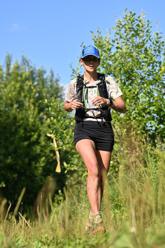 Из-за этой паузы немного отпустила Сашу. Теперь разметка ведет вдоль леса по скошенной траве. И полноценной дорогой не назовешь, но при этом точно не чистое поле. Трасса беговая. Меня нагоняет и обгоняет Настя. А я наслаждаюсь страданиями.