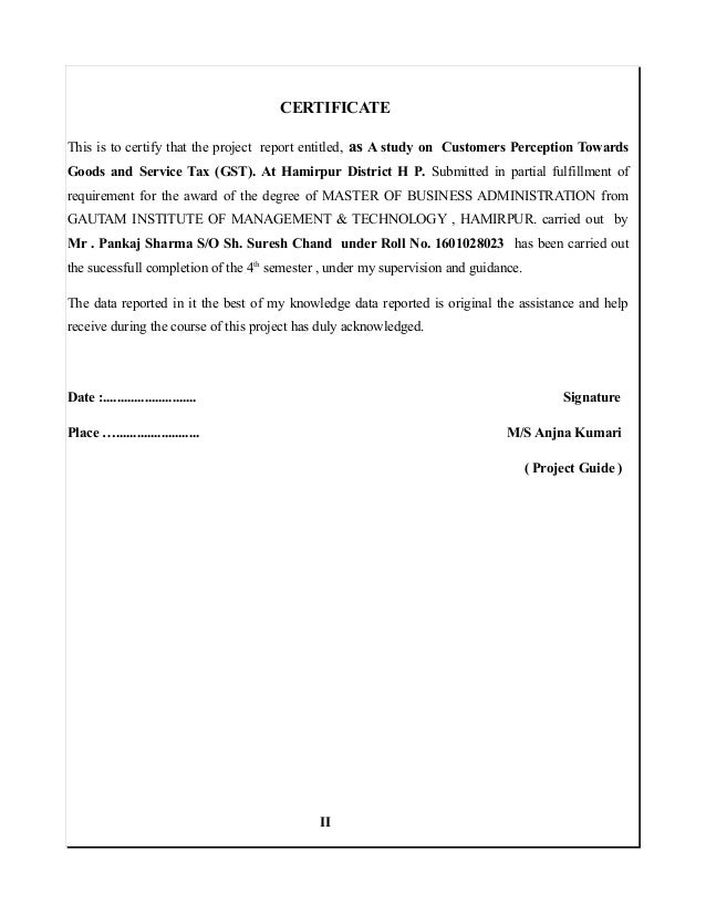 Project Report on GST 2018 1 . A Project Report on Customers Perception Towards GST ( Goods & Service Tax) in Distt Hamirpur Himachal Pradesh ( India) SUBMITTED FOR THE PARTIAL FULFILLMENT OF THE REQUIREMENT FOR THE DEGREE OF MASTER OF BUSINESS ADMINISTRATION Session 2016-2018 Submitted To : Submitted By : HP Technical University, Hamirpur Pankaj Sharma MBA Semester IV Roll No . (1601028023 . . .