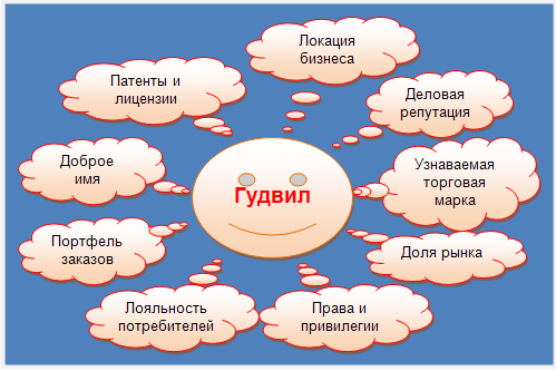 Гудвил представляет собой важнейшую компоненту интеллектуальной и коммерческой собственности компании, ее нематериального капитала. Гудвил включает в себя доверие потребителей, репутацию предприятия, связи в деловом мире, известность, славу, влияние. Помимо этого, гудвил охватывает и такие понятия, как управленческие, организационные, технические ресурсы, капитализированные права, привилегии, конкурентные преимущества, фирменные наименования, талисманы и торговые марки, права на пользования чем-либо. Денежная оценка всех вышеперечисленных элементов и составляет величину гудвила.