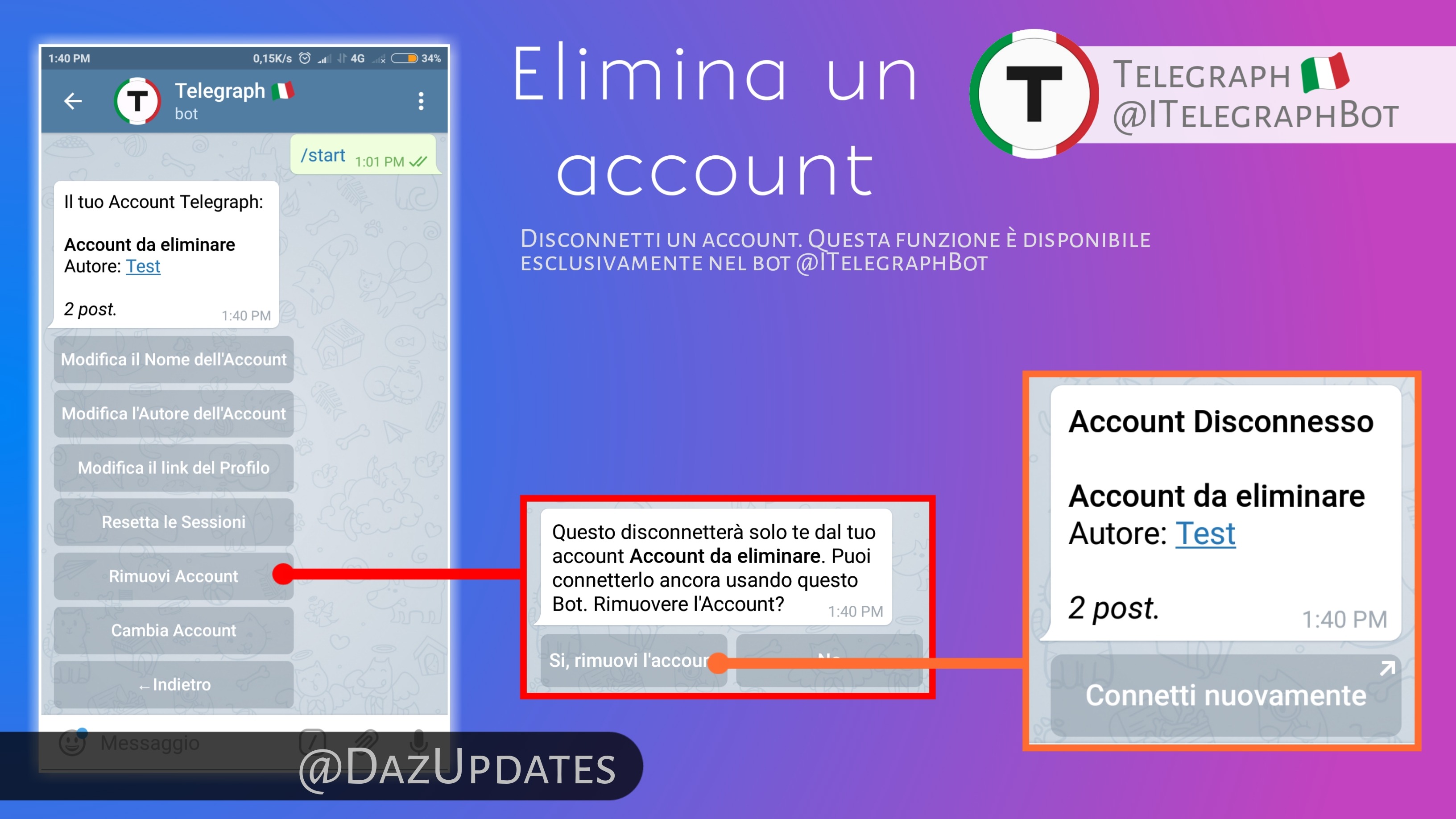 Nelle impostazioni dell'account spunta una opzione che è stata rimossa dal bot telegraph ufficiale: la possibilità di rimuovere un account. Questa funzionalità non va ad eliminare di fatto l'account o le pagine create da questo ma lo cancella dalla lista presente nel bot