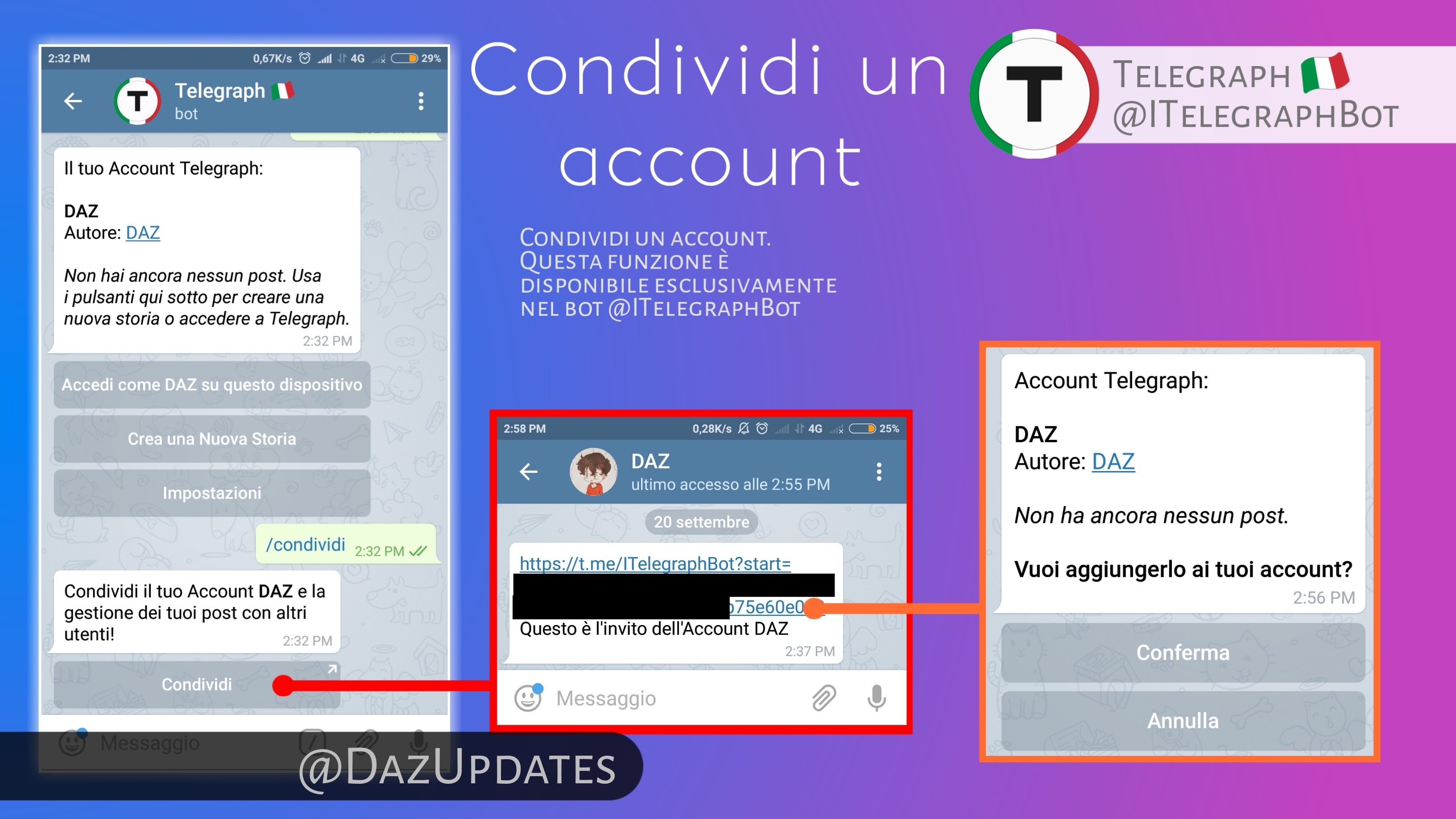 Un altra importante funzione è quella della condivisione di un account attraverso il comando /condividi che permetterà all' altro utente a cui invierai il link, di ottenere il tuo account e gestirlo come se fosse il suo.