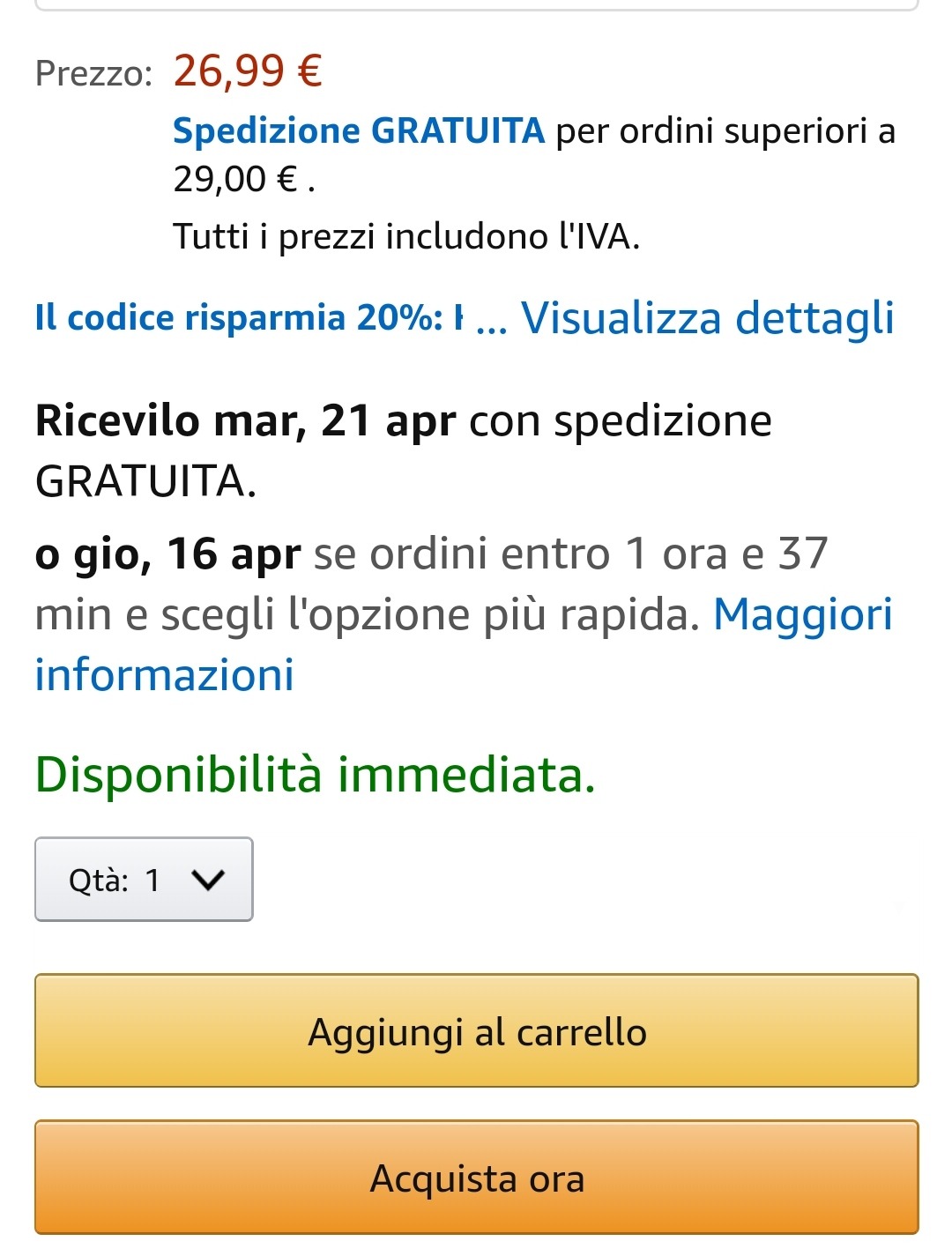 5️⃣ Ora ti ritroverai lo sconto nel riepilogo e ti basterà precedere all'ordine del tuo prodotto a prezzo scontato cliccando su "Acquista ora"