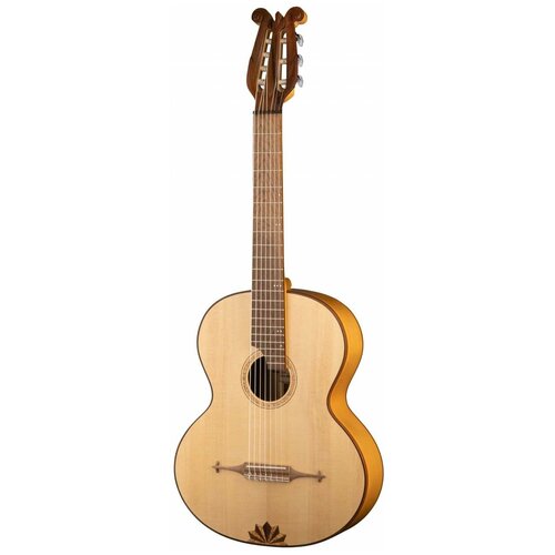 Guitare de salon russe à sept cordes fabriquée à l'image et à la ressemblance des guitares artisanales des maîtres russes du passé. Corps en érable massif, table d'harmonie en épicéa massif. Col 54 mm, échelle 650 mm. Belle tête de lyre, support vintage et incrustation de bois. Forme du corps : guitare de salon russe à sept cordes Longueur du corps : 480 mm Largeur du haut du corps : 285 mm Largeur du bas du corps : 390 mm Épaisseur du corps : 90 à 100 mm Table : épicéa massif du Caucase Fond