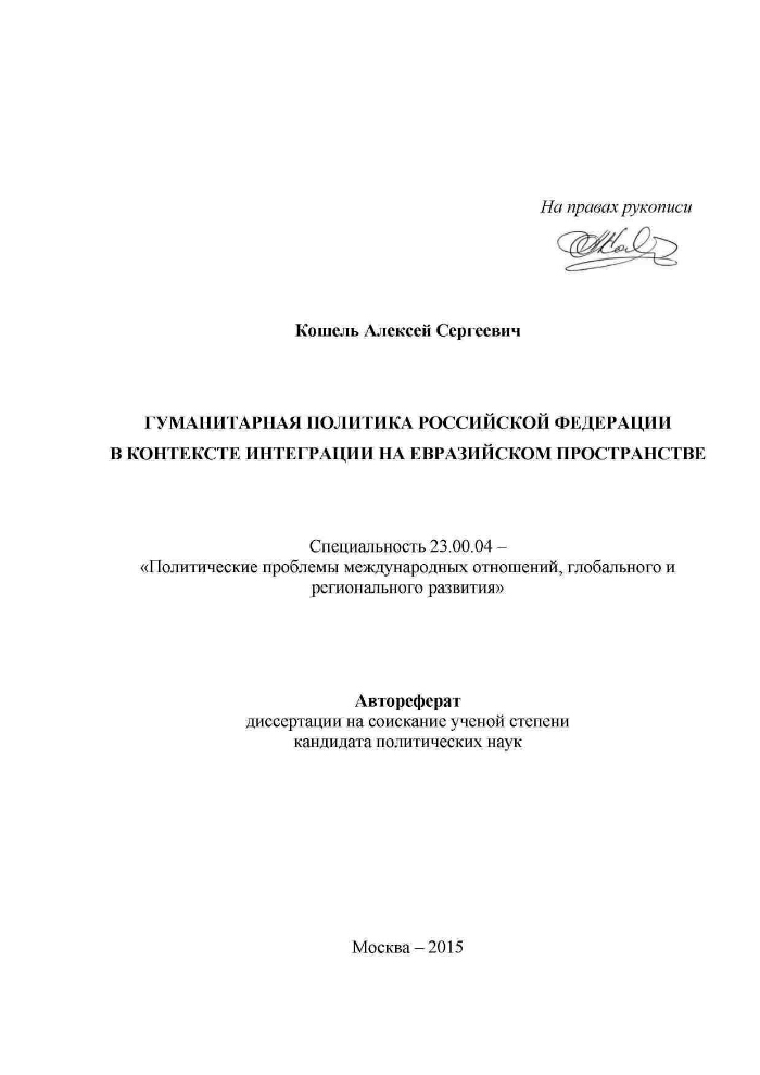 Гуманитарная политика Российской Федерации в контексте интеграции на Евразийском пространстве диссертация . Научный руководитель: . . .