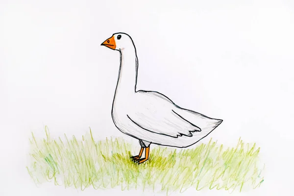 Рисунок с гусем и фоном для младших классов: иллюстрация к сказке и реалистичный эскиз . Урок номер 6 - Гусь на природе . Фото нарисованного карандашом и красками гуся .
