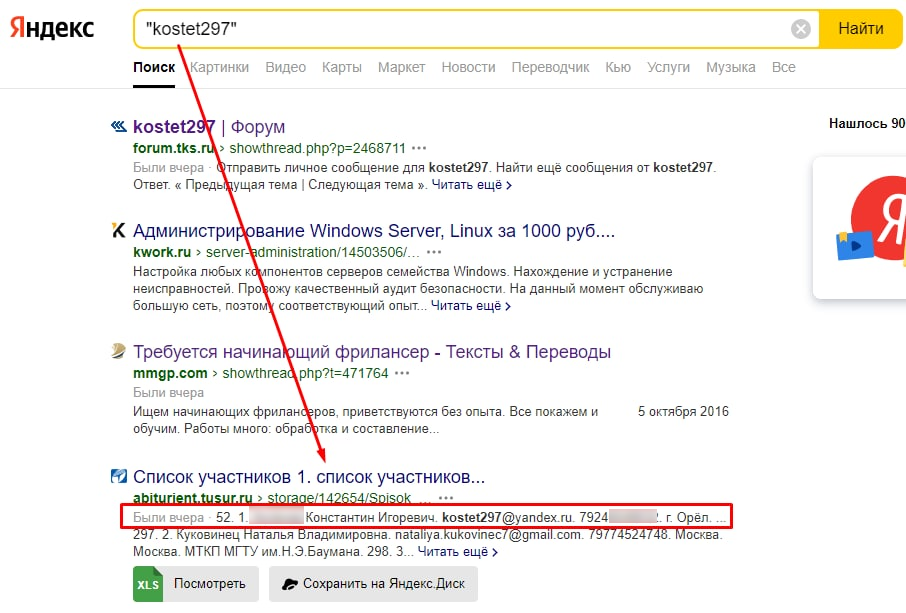 Банальный поиск в Яндексе позволяет сопоставить электронную почту с реальными данными человека.