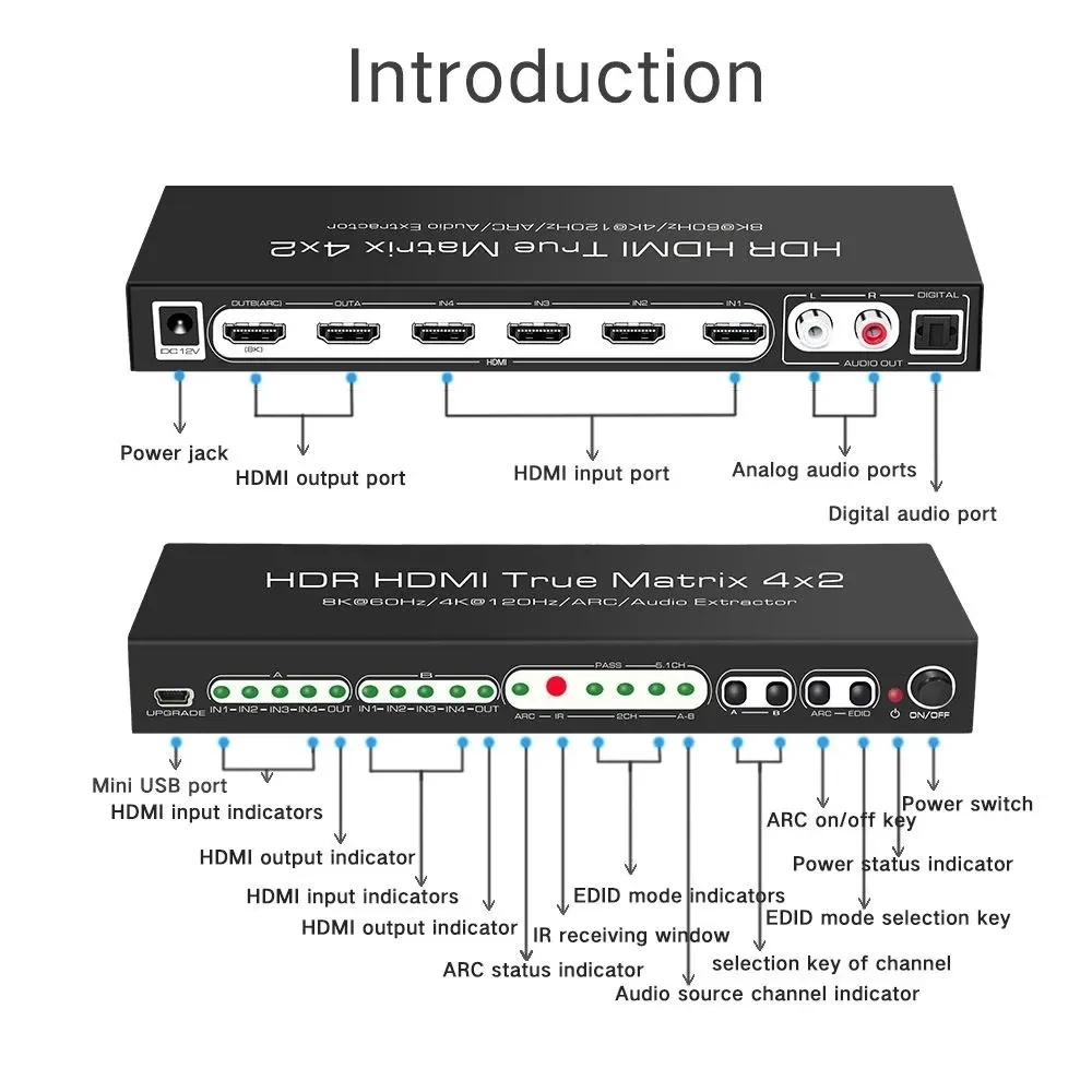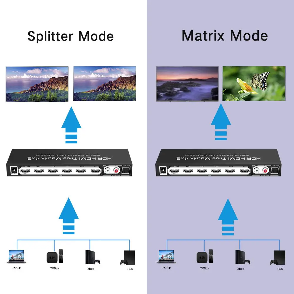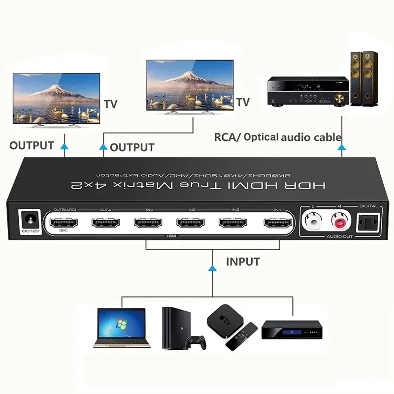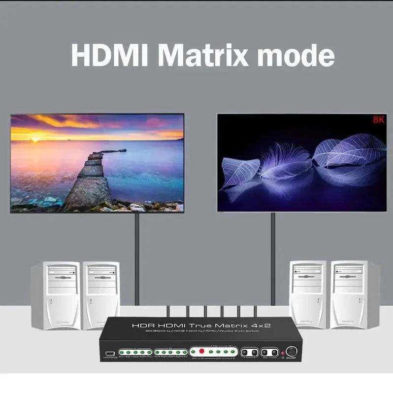 PSwDkCCrHere you can buy HDMI Matrix Splitter 4 In 2 Out HDR 4K 120Hz 8K 60Hz Dolby Vision Atmos Remote Control HDMI Switch Selector Box for PS5 XBOX TV with free delivery to your post office.
