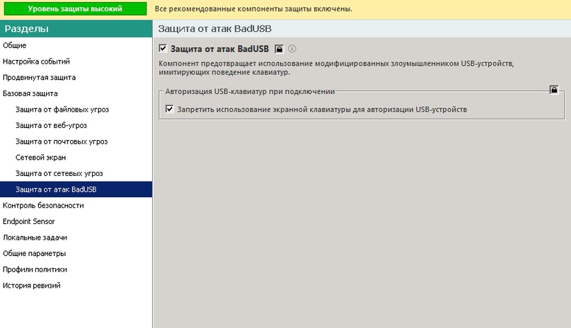 Что касается ОС Windows, то тут есть несколько решений. Во-первых, комплексные антивирусы. Они уже научились определять класс BadUSB и блокировать такие устройства. К примеру, в серверной части «Антивируса Касперского» при настройке политик безопасности есть функция «Защита от атак BadUSB».