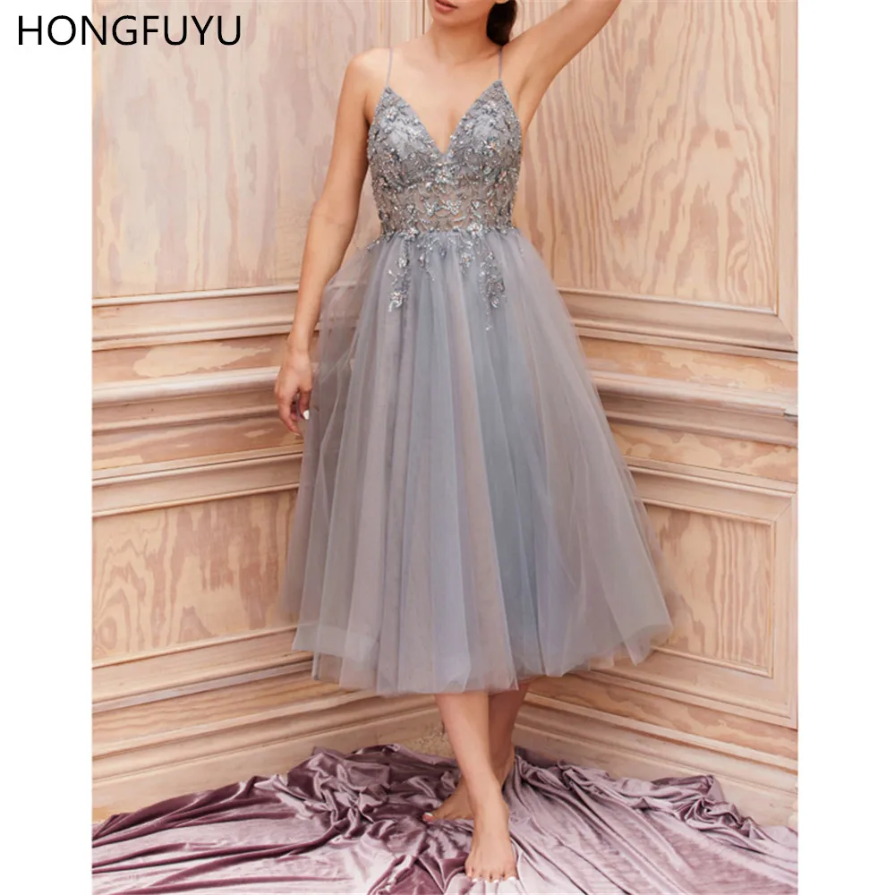 HONGFUYU Soft Tulle Short Prom Dresses Midi Length A Line Split Spaghetti Strap Evening Party Gown Floral Beading Cocktail Dress