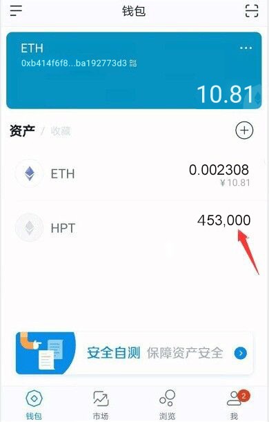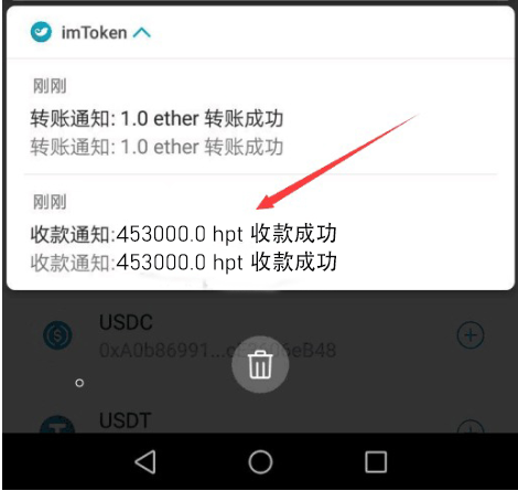 发送成功后,兑换的HPT 立即到账,无须等待,全程智能矿池合约自动执行,安全可靠。imToken钱包界面会有对应提示,如下图右上方,箭头处,点开即可(如果没有提示下拉主界面刷新即可)