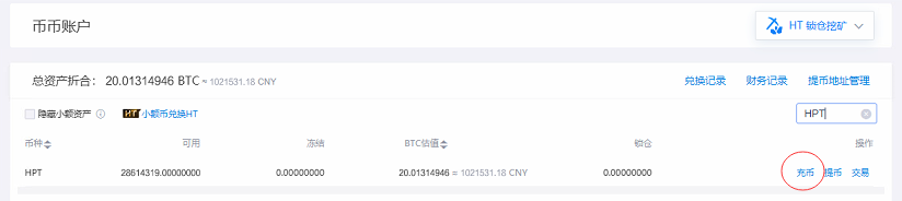 充值智能合约兑换的 HPT到交易所