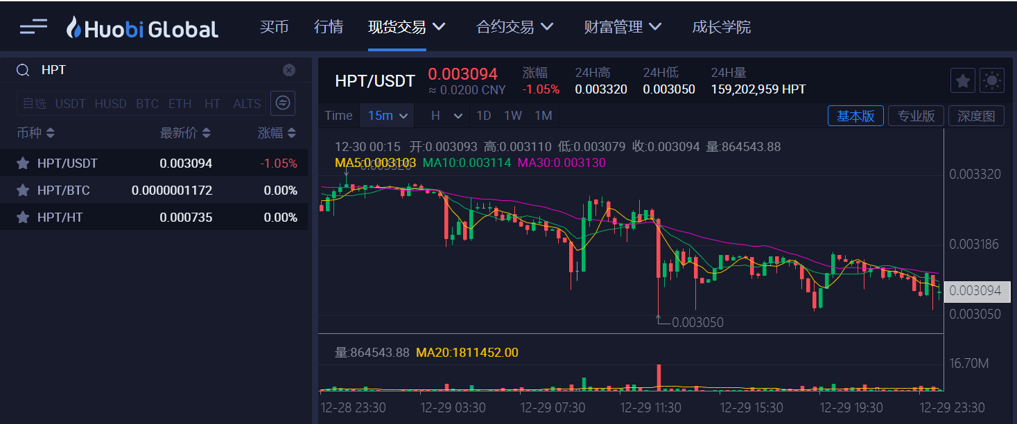 2、进入火币交易所卖掉,落袋为安,也可持有HPT,享受其他权益币的空投福利: