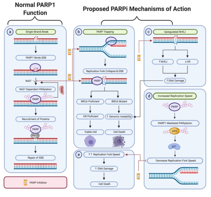 ДНК в области репликационной вилки подвержена одноцепочечным разрывам, устраняемым за счёт активности PARP1, который распознаёт повреждение и привлекает другие белки репарации к этому месту. Действие PARPi связывают с несколькими механизмами: