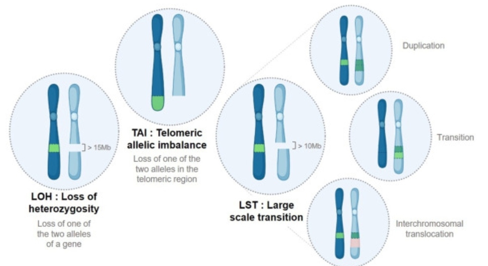 Основной проблемой является отсутствие общепринятого определения для HRD. Есть несколько тестов для его детекции, которые используют различные биомаркеры и алгоритмы, поэтому их трудно сравнивать между собой. Самих тестов существует множество, мы же обсудим самые известные в научной среде. В основном это специальные панели NGS с определённой биоинформатической обработкой. Чаще всего для косвенного обнаружения HRD используются панели, которые определяют так называемые геномные “шрамы”, или “рубцы”, оценивающие аллельный дисбаланс. К геномным шрамам относят: