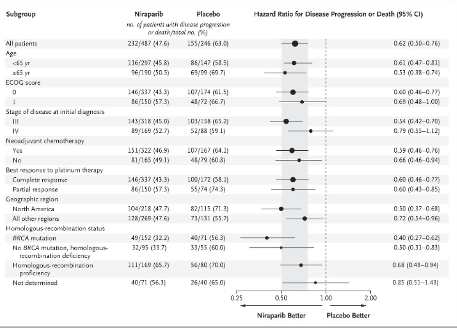 P – пациентки с high-grade серозным или эндометриоидным раком яичников, маточной трубы и первичным раком брюшины III-IV стадий с частичным или полным ответом после 1 линии платиносодержащей химиотерапии вне зависимости от результатов операции. Пациенты могли получать неоадъювантную терапию;