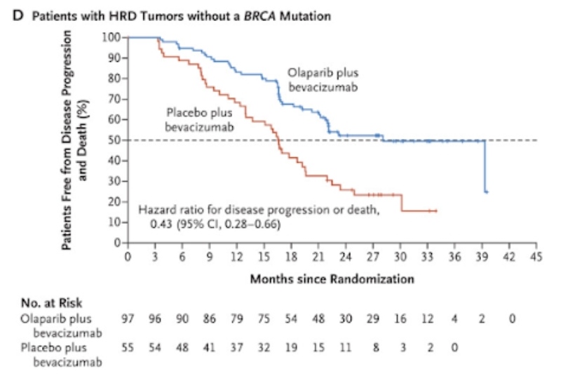 У пациенток с положительным статусом HRD без мутаций BRCA1/2 медиана ВБП составила 28,1 против 16,6 месяца (HR=0,43, 95% ДИ 0,28-0,66).