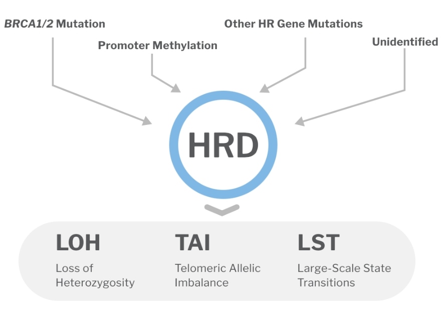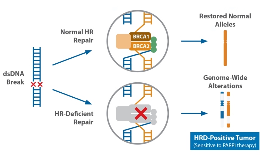 Гомологичная рекомбинация (homologous recombination, HR или HRR) – это механизм репарации двухцепочечных повреждений ДНК, при котором в качестве матрицы для исправления используется сестринская хроматида, что обеспечивает минимальный уровень ошибок. О работе белков HRR мы более подробно поговорим в отдельной статье. Клетки с дефицитом гомологичной рекомбинации (HRD) неспособны эффективно исправлять двухцепочечные разрывы, так как используют другие, менее эффективные системы репарации. Таким образом, клетки накапливают большое количество изменений, что ещё называется геномной нестабильностью. Дефицит гомологичной рекомбинации обычно вызван герминальными и соматическими мутациями генов HRR (чаще BRCA1 и BRCA2), но может быть обнаружен и без них. Причиной этого могут быть, например, эпигенетические изменения.