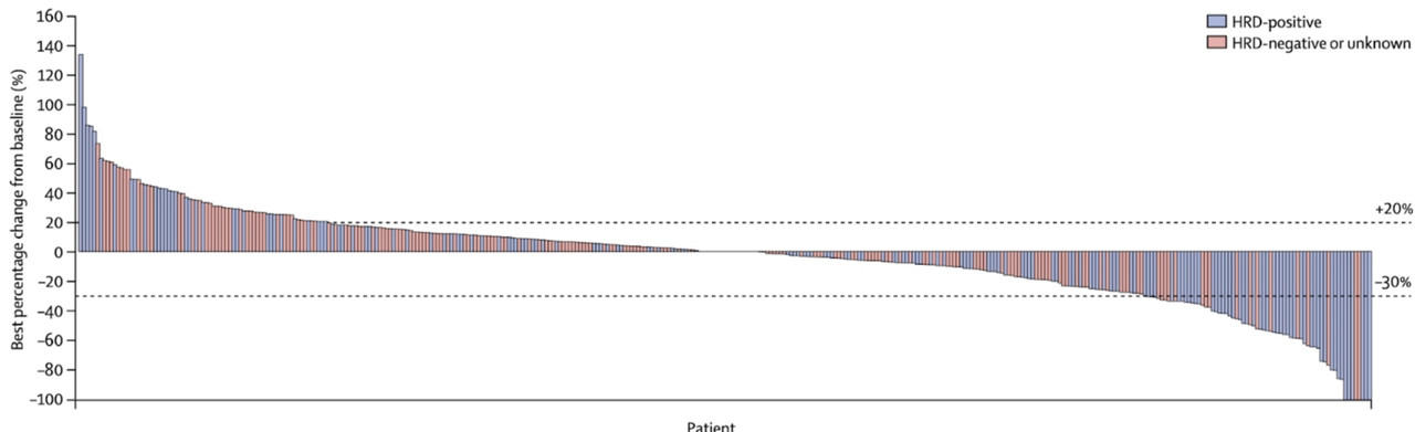HRD+ пациентов, чувствительных к платиносодержащей химиотерапии после последней линии, было всего 47, 13 из них (28%) имели объективный ответ, 19 из 47 достигли стабилизации (40%). Важно понимать, что в эту группу входили пациенты с известными мутациями BRCA1/2.
