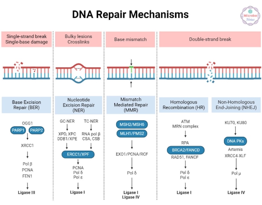 ДНК постоянно находится под воздействием внешних факторов и внутренних процессов, в том числе репликации ДНК, формирования свободных радикалов, которые приводят к различным её повреждениям. Такими поломками могут стать точечные мутации, двухцепочечные и одноцепочечные разрывы, межнитевые и внутринитевые сшивки. Эти повреждения исправляются различными системами репарации, что поддерживает стабильность генома.