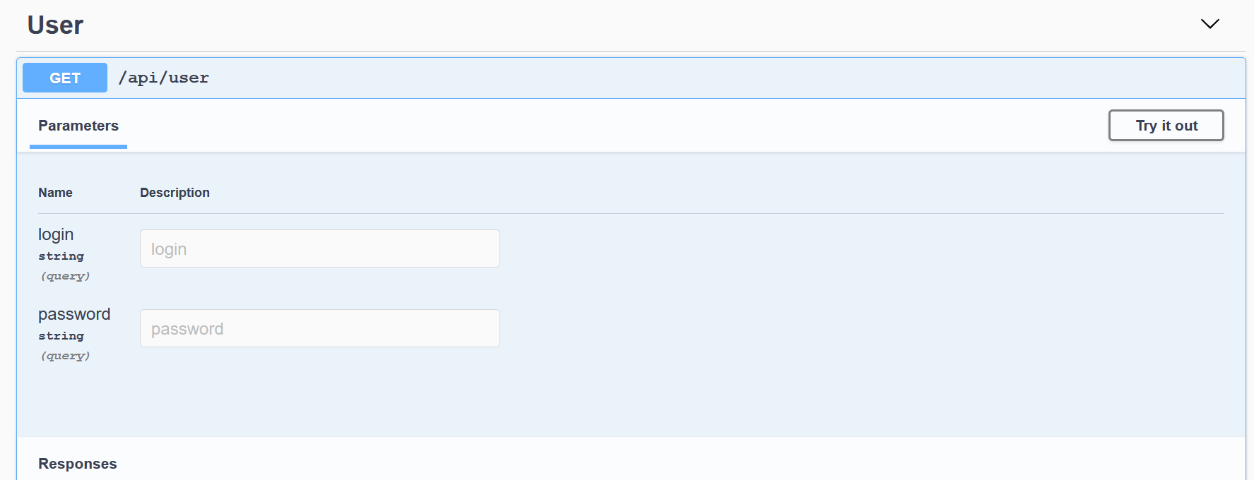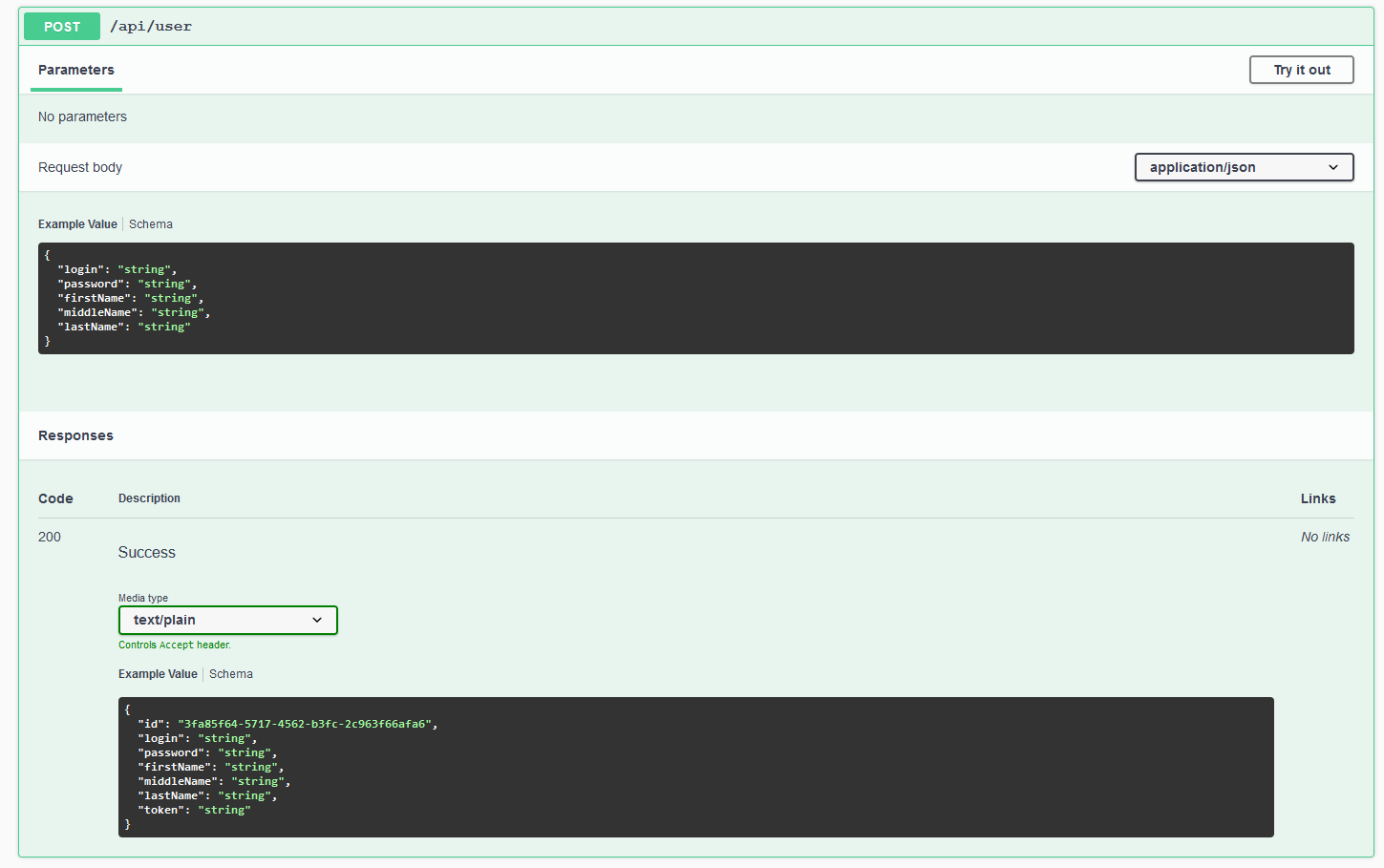 Для начала попробуем произвести регистрацию. Так как она, по своей сути, является созданием пользователя, мы используем эндпоинт /api/user с методом POST. Чтобы посмотреть подробную информацию о запросе, нужно на него нажать.