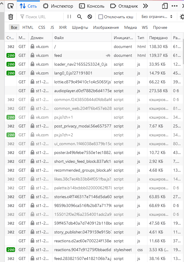 Рассматривать выполняемые запросы будем на примере сайта ВКонтанте. Для этого с открытыми инструментами разработчика перейдём на vk.com. Мы получили множество различных запросов, которые произвела страница для получения данных.