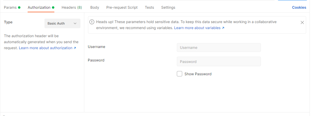 Здесь настраивается авторизация. При выборе определённого типа откроется форма с полями, которые необходимо заполнить. Самые распространённые типы авторизации - "Basic Auth":