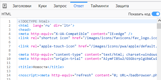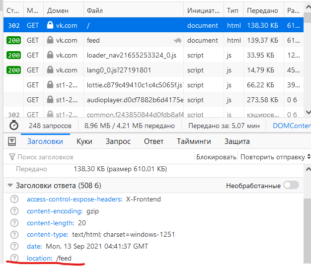 И действительно, в адресной строке теперь не vk.com, а vk.com/feed. Следующим запросом наш браузер получил html-код запрашиваемой страницы. Тело ответа можно посмотреть во вкладке "Ответ" (Response, Preview)