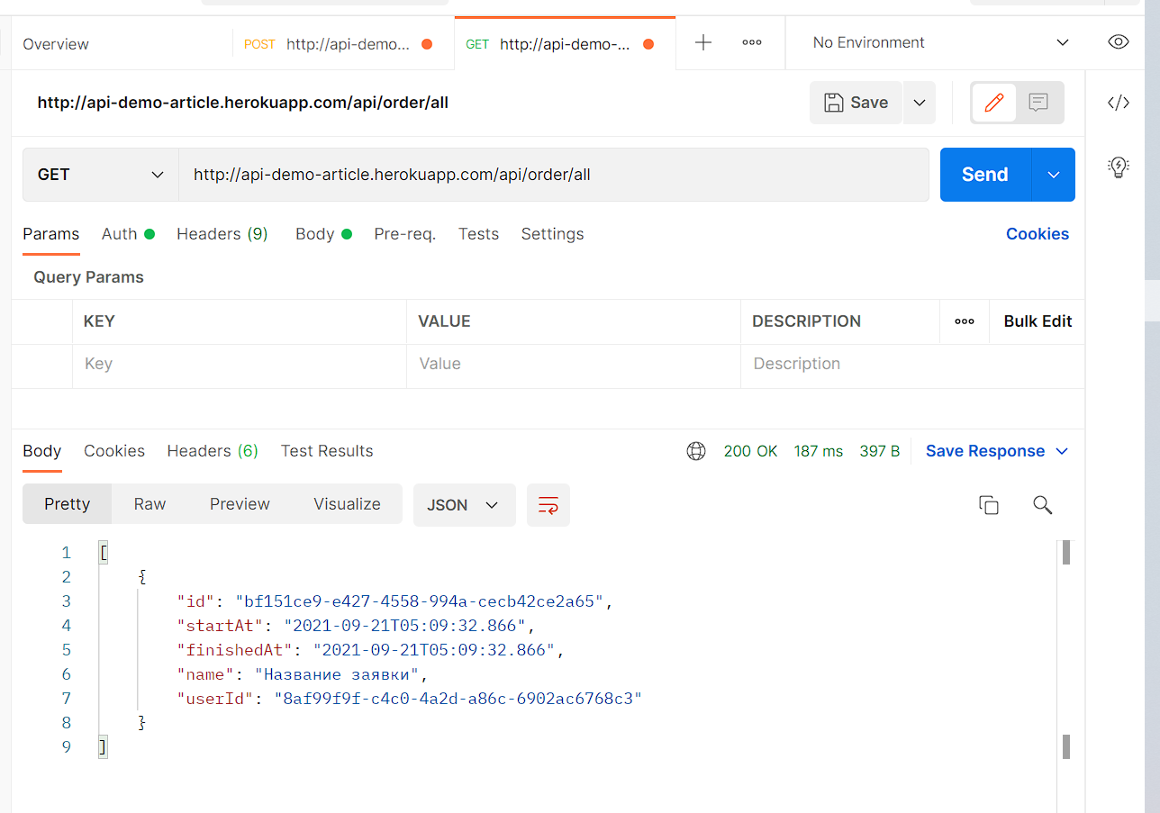 Мы получили успешный ответ. В документации также указан метод api/order/all, позволяющий получить все доступные заявки. Воспользуемся им: