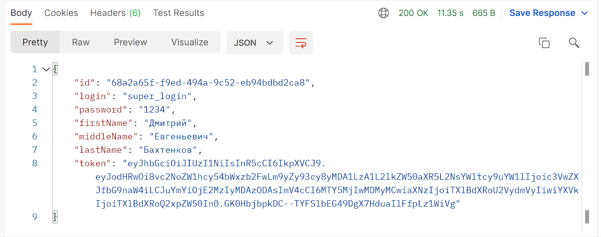 Здесь указан статусный код (в нашем случае 200 OK - успешное выполнение), время за которое был выполнен запрос и прочая информация. Ниже мы видим тело ответа - тоже данные в формате JSON, с моделью описанной в документации. Обратите внимание на токен - это токен авторизации. Он указывается в заголовках запросов, требующих авторизации. В разработанном приложении применён тип авторизации Bearer, суть которого как раз и заключается в применении таких токенов. Подробнее про это можно почитать в отдельной статье.