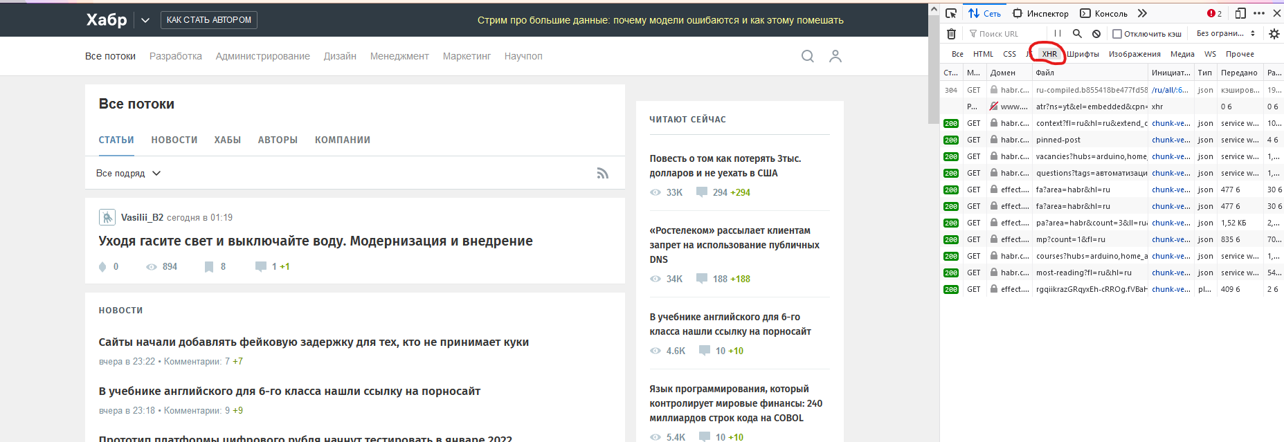 Теперь попробуем закрыть вк и перейти на habr.com с открытыми инструментами разработчика. Во вкладке "Сеть" выберем запросы xhr. Это как раз те запросы, которые фронтенд сайта отправляет на сервер для получения данных. Клиентское приложение затем генерирует html-код, который мы видим.