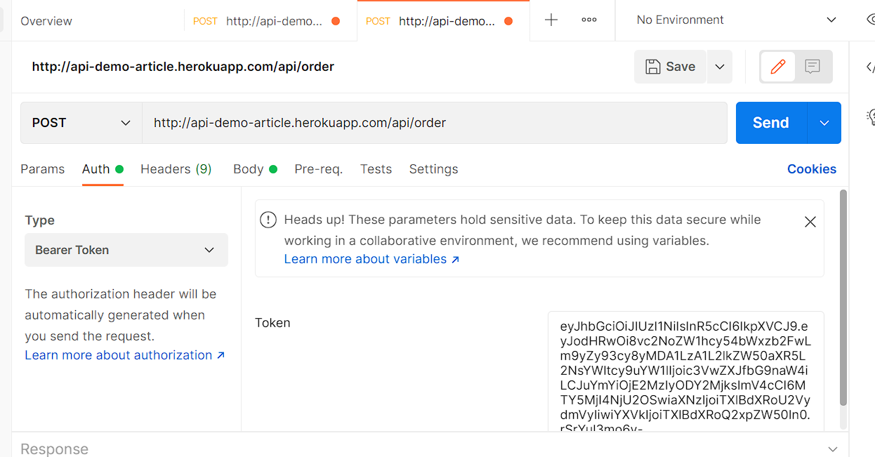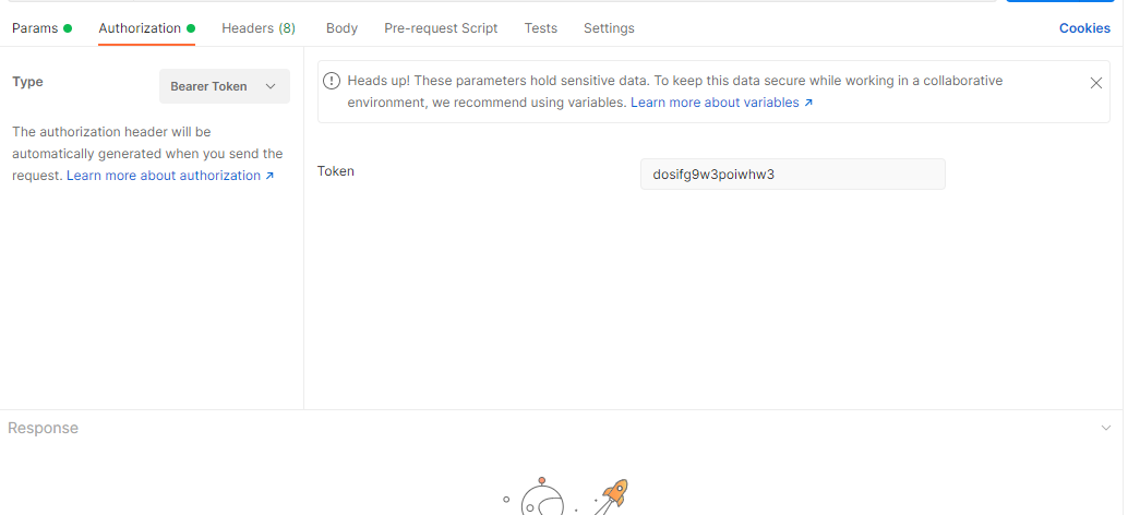 Перейдя во вкладку Headers мы увидим новый заголовок Authorization - токены авторизации как раз передаются в заголовках запроса. Попробуем выполнить запрос снова: