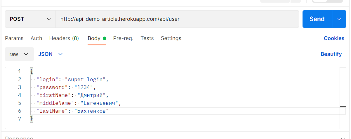 Попробуем зарегистрироваться через API - для этого откроем Postman, выберем метод POST и введём нужный URL и заполним тело запроса.