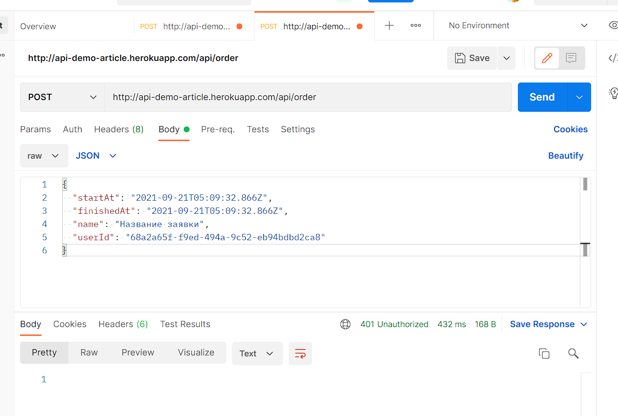 и воспроизведём его в Postman, в отдельной вкладке. Как мы видим, в запросе требуется указать идентификатор пользователя - UserId. Скопируем его из ответа предыдущего запроса - из поля Id и попробуем отправить запрос: