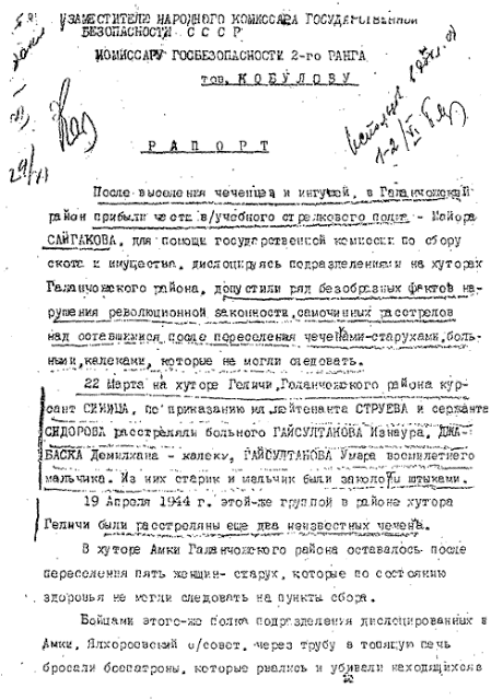 «В феврале 1944г. В маленьком горном селении Чечено-Ингушетии войсками НКВД были заживо сожжены несколько сот мирных жителей…
