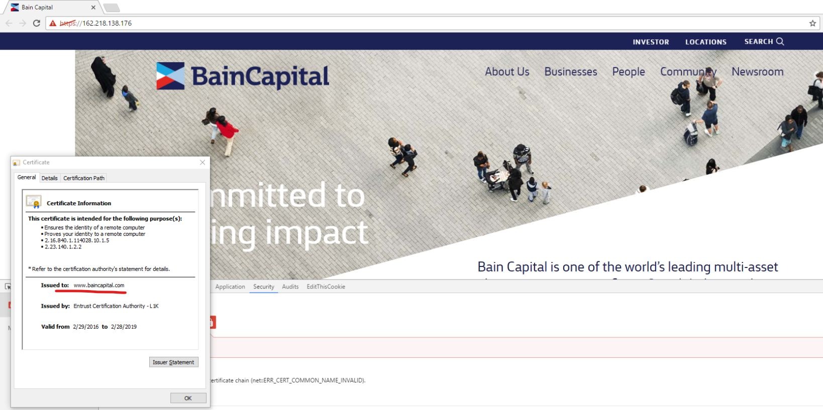 Видим, что раньше домен резолвился на IP 162.218.138.176, перейдем на него в браузере. Наблюдаем главную страницу Bain Capital, также можно заметить, что сертификат выдан на имя baincapital.com. Хороший знак, сравним с оригинальным сайтом https://baincapital.com — они идентичны.