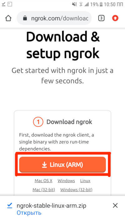 Далее надо скачать архив с ngrok для Linux-based-систем с архитектурой ARM.