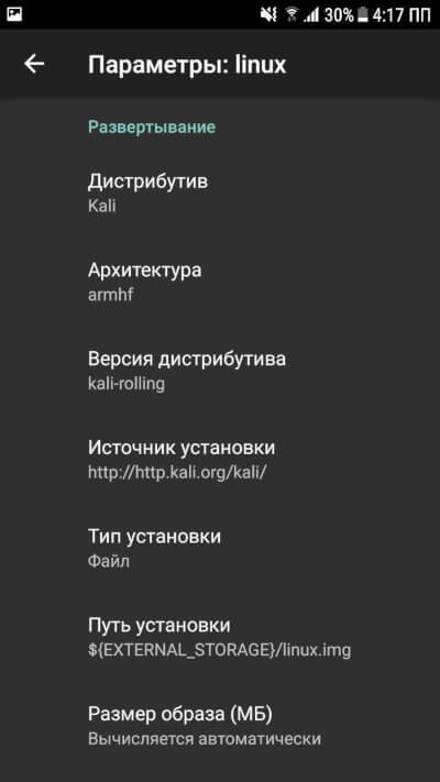 Теперь заходим в Linux Deploy и справа внизу нажимаем на иконку настроек дистрибутива. Выбираем дистрибутив Kali Linux. Нужная архитектура выставится автоматически, но, если не получится, попробуйте armhf.