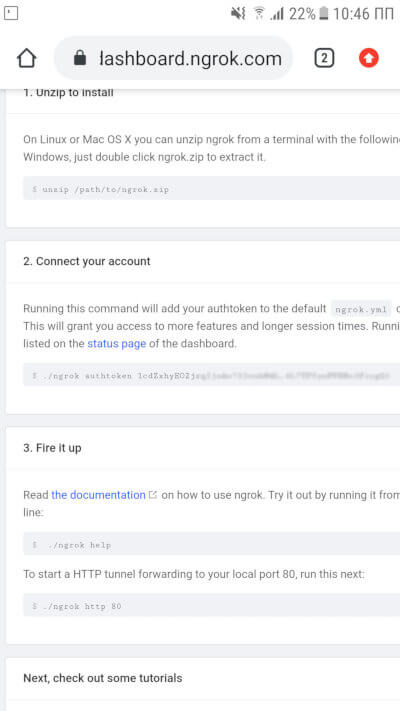 Помните, вы копировали свой токен для аутентификации? Впишите эту команду, чтобы ngrok знал, кто его использует: