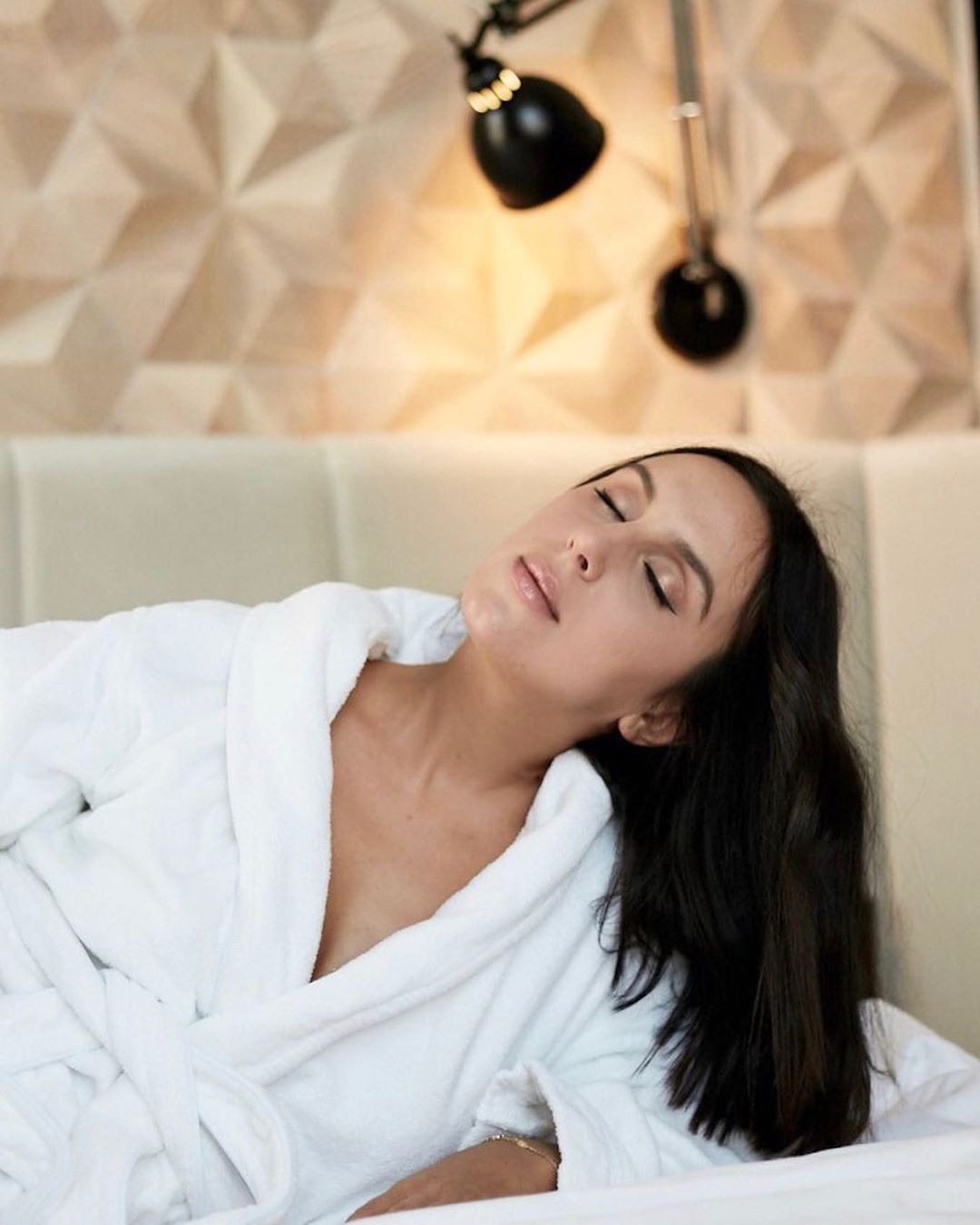 На фото в Instagram она запечатлена на кровати, при этом на артистке лишь белый халат на голое тело, а также полотенце на голове - она явно только что вышла из душа .