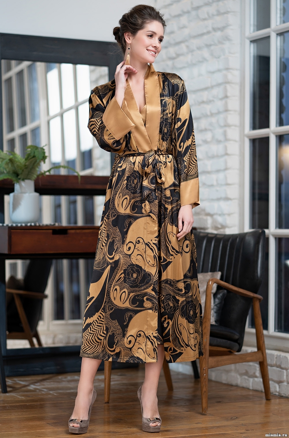 Длинный атласный халат нежного розового цвета с узором пейсли выглядит, как платье на выход . Он идеально подходит для домашней встречи с друзьями, стоит лишь надеть туфли-лодочки .