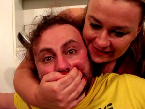 Curly haired wife watches husband jackoff
